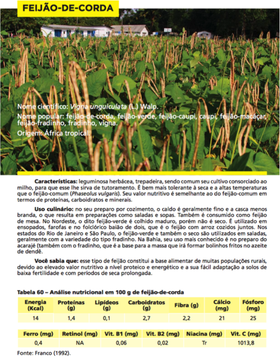 Dados sobre Feijão-de-Corda, do livro Alimentos Regionais Brasileiro. No portal www.saude.gov.br/promocaodasaude, é possÃvel baixar a versão digital completa do livro.