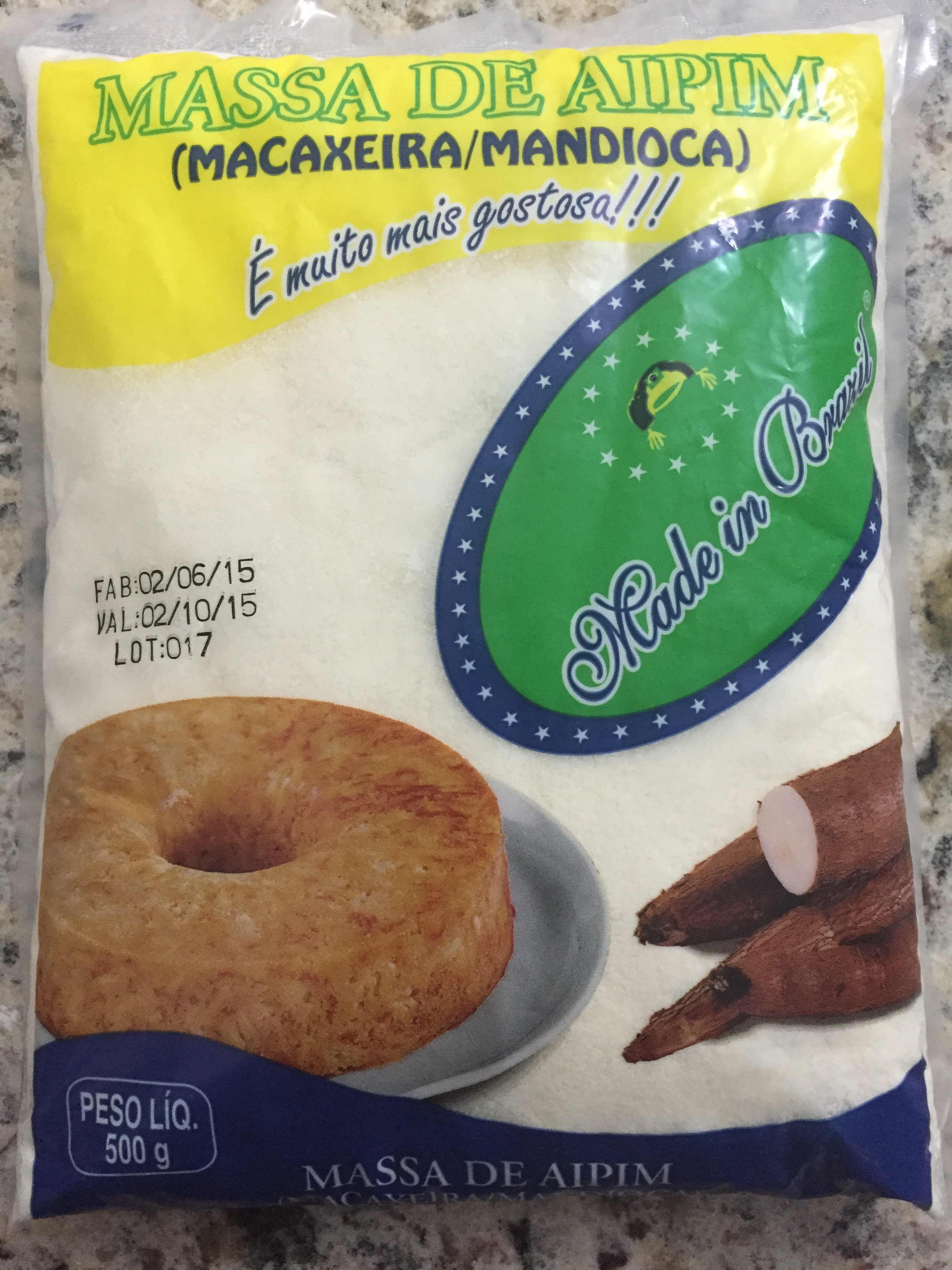• 500 g de massa pronta de aipim (foto da embalagem abaixo)