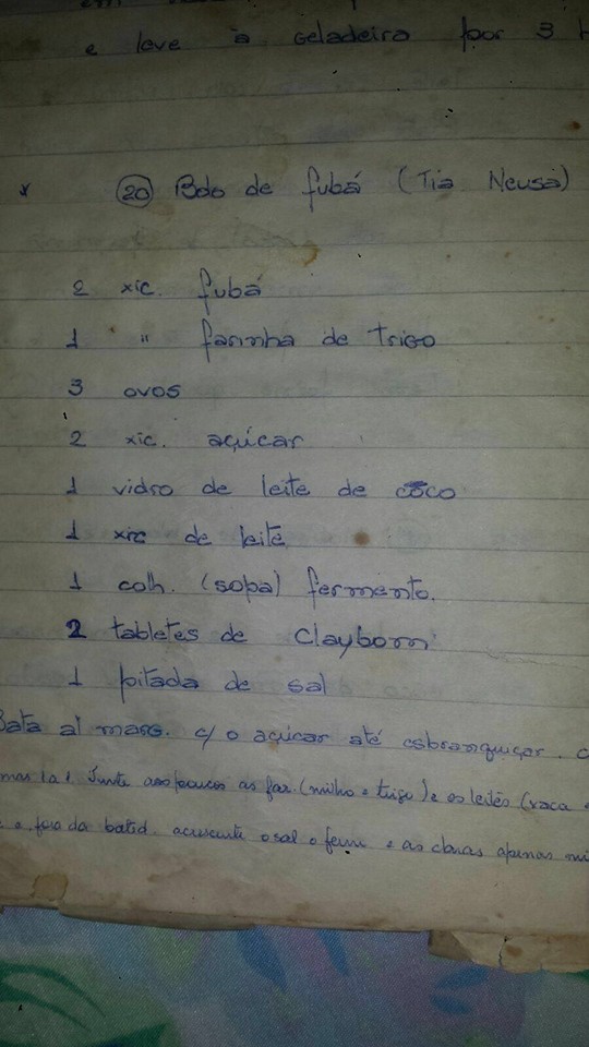 A receita abaixo, recebi via Facebook (Denise Marcolino), é um BOLO DE FUBÁ DA TIA NEUSA, carinhosamente escrita nos antigos cadernos de receitas.