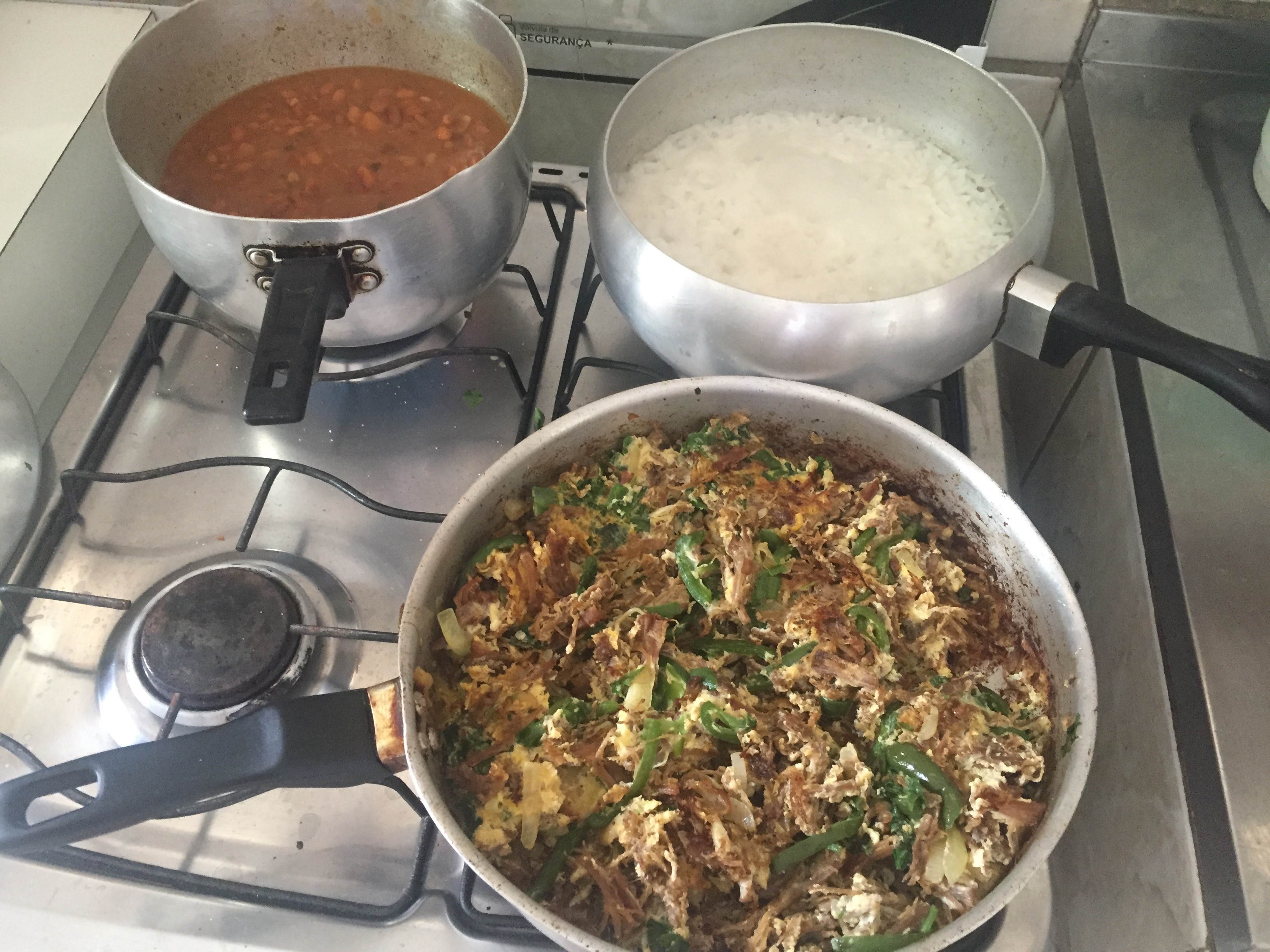 Com arroz e feijão. Farinha de mandioca e pimenta.