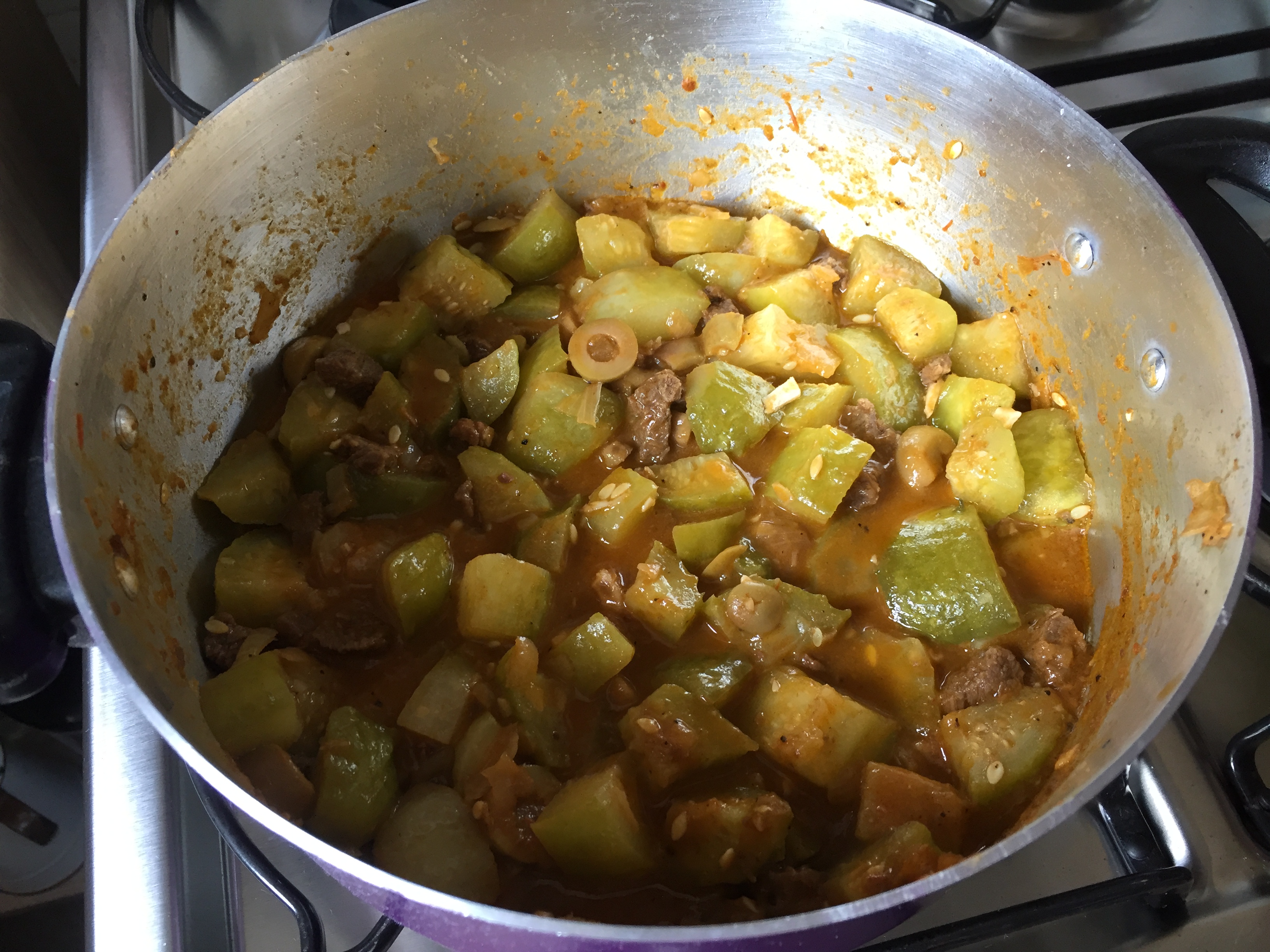 • Acrescente o molho de tomate e a carne e deixe cozinhar até os maxixes estiverem macios;