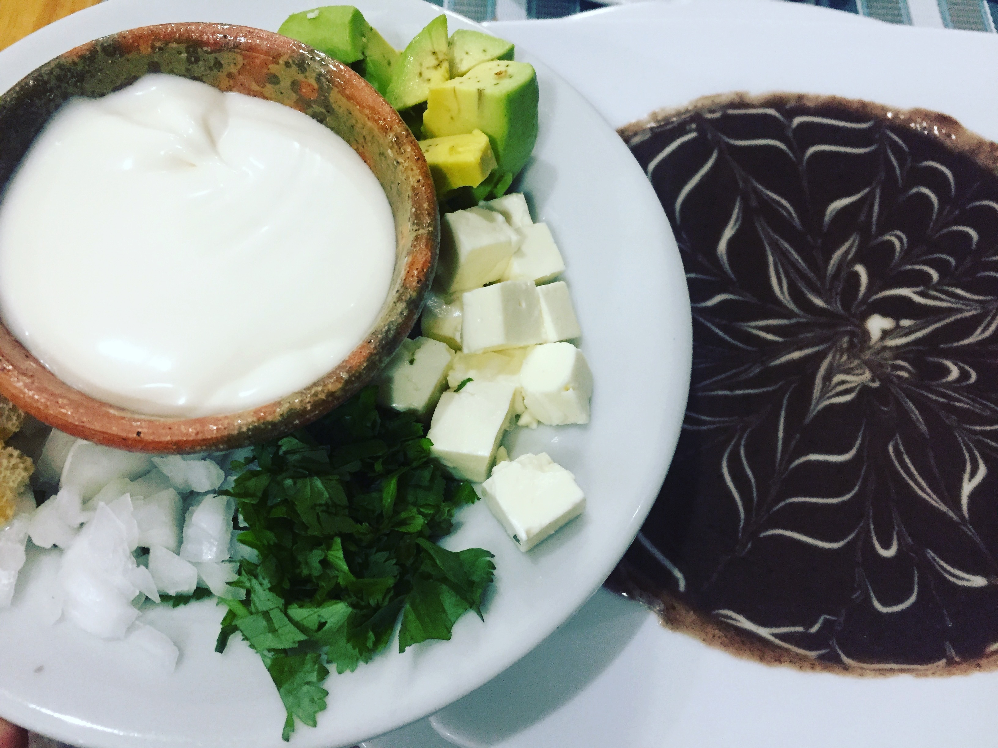 A sopa abaixo (com cara de café gigante) é feita com vários tipos de feijões (frijoles), com predominância do preto. Poderia sair da minha ou da sua cozinha, se não fosse a dose extraforte de cultura (Maia?) que carrega no pratinho dos acompanhamentos. A ideia é você mesmo ir adicionando ao seu gosto, em um ritual da fusão dos gostos, o abacate, o coentro, o queijo branco, a cebola (muito forte), um creme lácteo meio azedo e os crótons, esse com certeza uma adição do chef da casa que deve ter feito a releitura do prato. Jamais pensei em misturar na boca sopa de feijão, abacateÂ