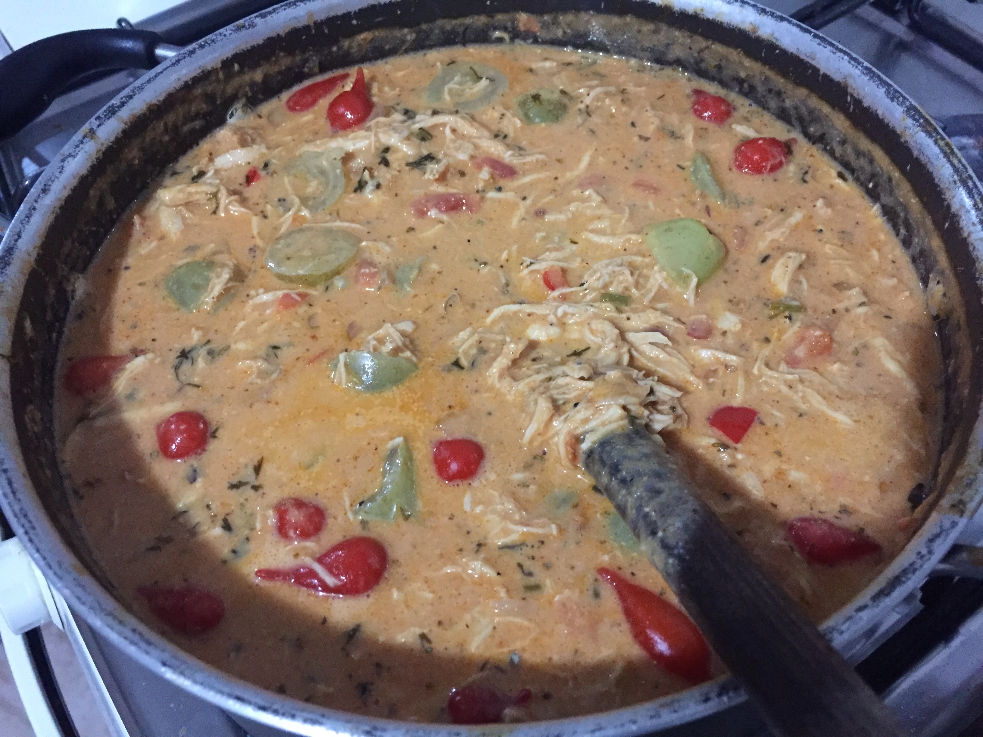 Frango desfiado e temperado, molho de tomate, creme de leite, uva verde sem caroço, pimenta biquinho, tomate, pimentão, cebola, coentro, orégano, sal e pimenta do reino. Tudo picadinho e a gosto na panela. Fogo até ferver bem e apurar.