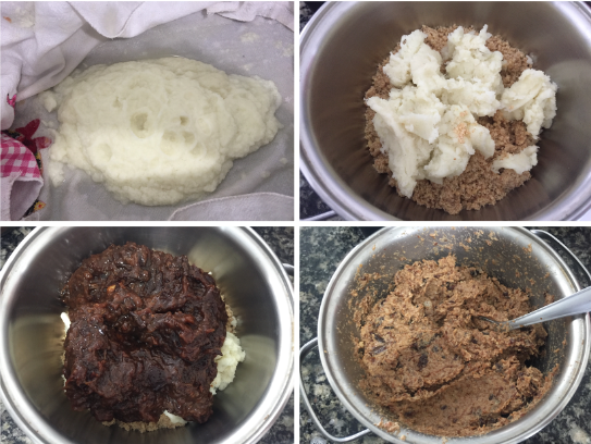 - Misturar a cebola processada, as nozes moídas e a pasta de ameixa (deve formar uma massa não muito pastosa, para isso, adicione a pasta de ameixa aos poucos);