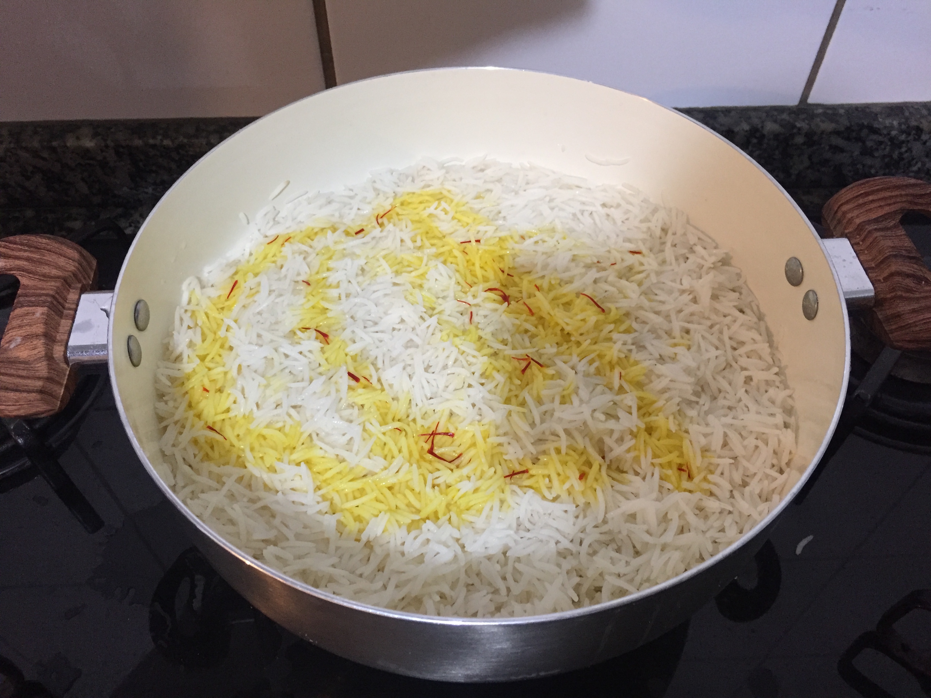 - 2 ½ xícaras de arroz BASMATI (variedade de arroz, de grão longo, de origem indiana, também muito usado no Irã)