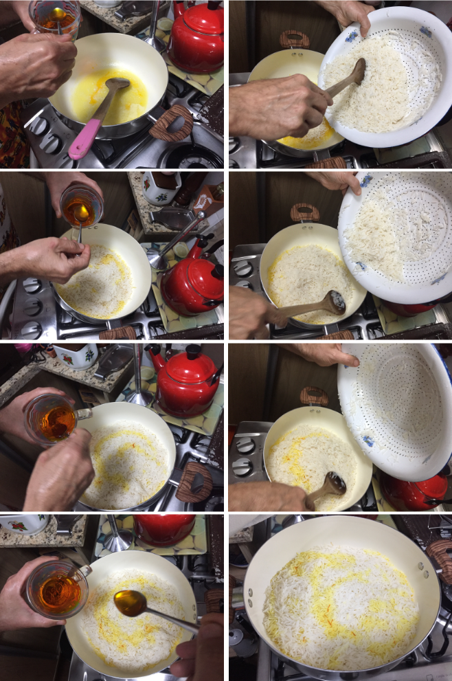 A alma da cozinha persa. A camada dourada e crocante de arroz frito no fundo e paredes da panela é o grande diferencial desse arroz. Nas reuniões das famílias iranianas sempre está presente para acompanhar outros pratos. É um ato de afeto e cortesia oferecê-lo nas refeições para parentes e amigos.