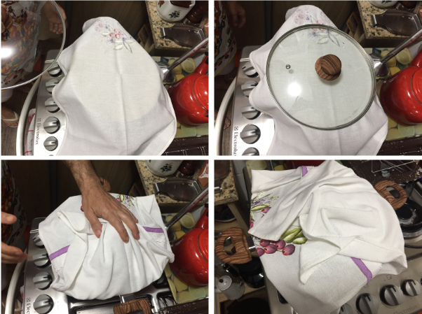 - Coloque um pano de prato seco sobre a panela (cuidado com o fogo no pano), coloque a tapa por cima e evolva a tampa com a sobra do pano de prato;
