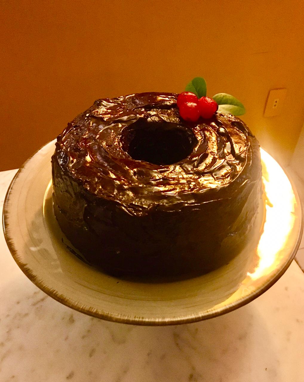 - Retirar o bolo do forno; deixar esfriar um pouco; desenformar ainda morno e espalhar a cobertura de chocolate por todo o bolo;