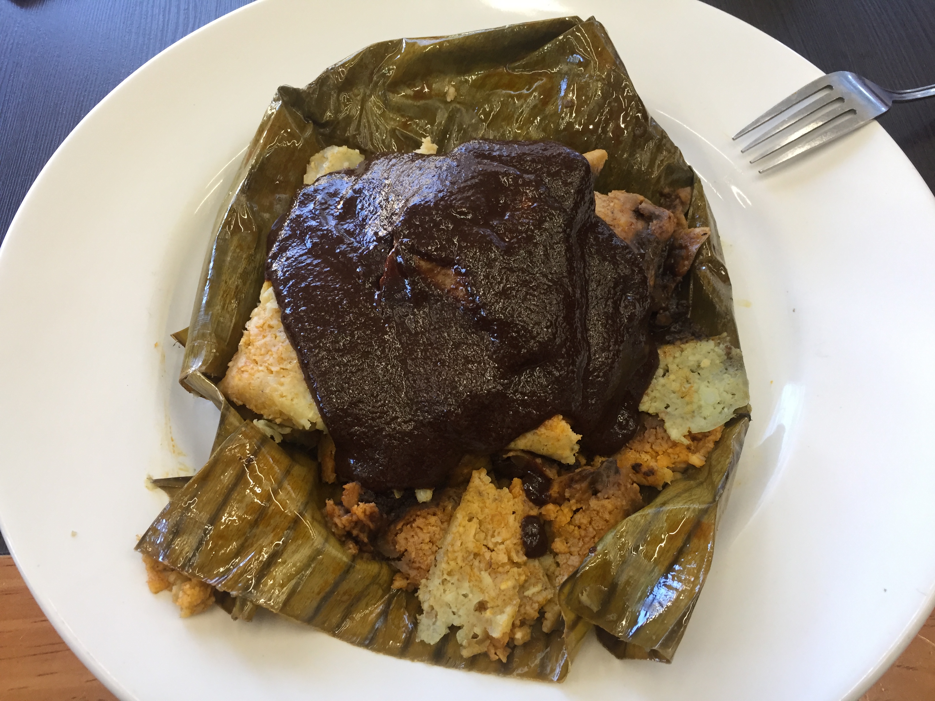 Tamal com Mole (massa de milho recheada com frango, coberto com mole de Oaxaca, tradicional molho feito com muitos ingredientes, tendo o chocolate 100% como protagonista). Estava muito bom e muito picante (apimentado). O Tamal é cozido na folha da bananeira, e isso me lembra nosso Abará da cozinha Afro-baiana, que acho que também ficaria uma delícia com o Mole. As diversidades culinárias se encontram, se conversam e se completam em sabores, aromas e tradições.